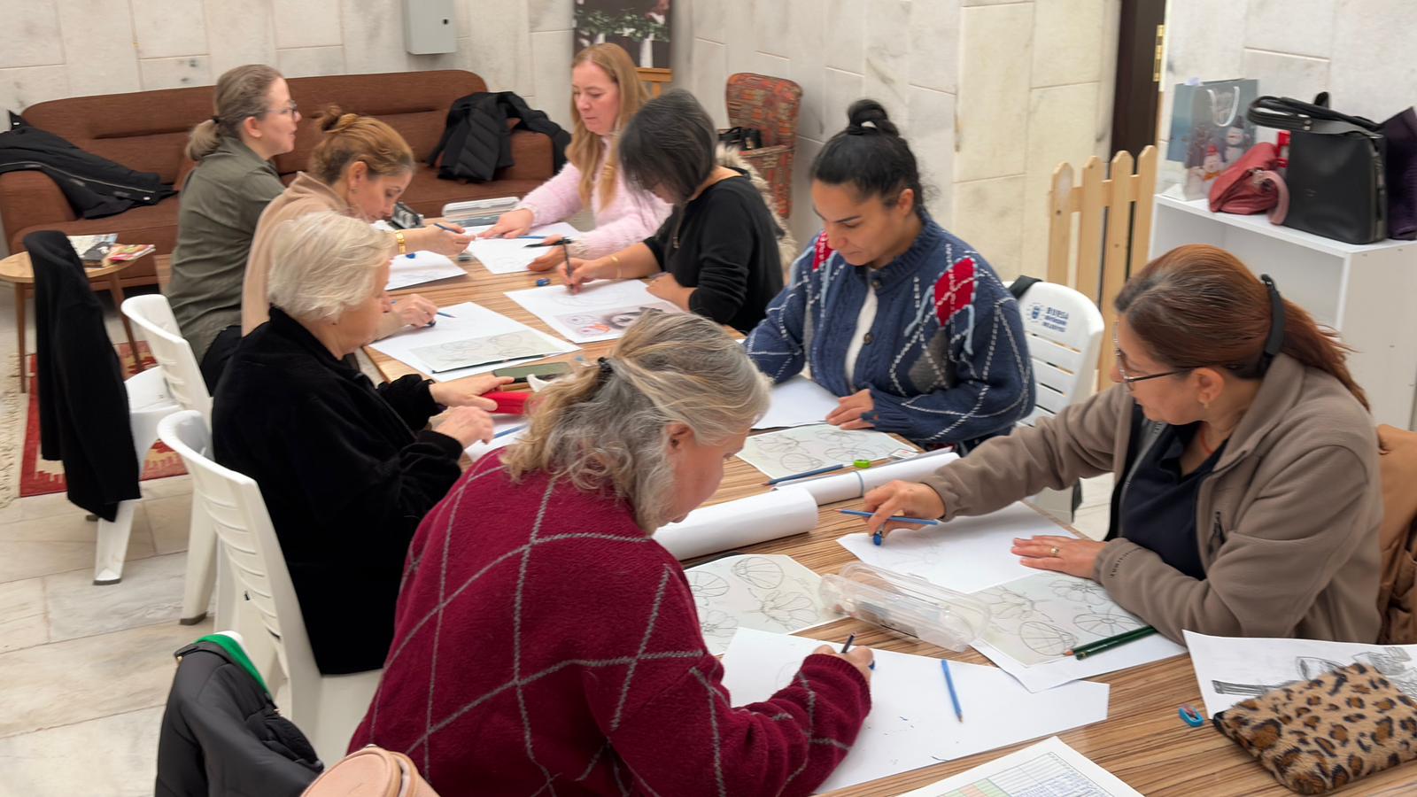Kadınlara özel olarak devam eden atölye kapsamında katılımcılara çizim ve boyama alanında temel teknikler aktarılırken, farklı malzemelerle yapılan uygulamalar sayesinde sanatsal ifade becerileri güçlendiriliyor.