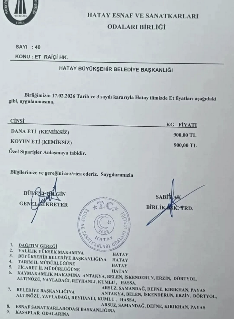 Hatay, 22 Şubat (Hibya)-Hatay Esnaf ve Sanatkarları Odaları Birliği’nin 17 Şubat 2026 tarihli kararıyla il genelinde dana ve koyun etinin kemiksiz kilogram fiyatı 900 TL olarak belirlendi.