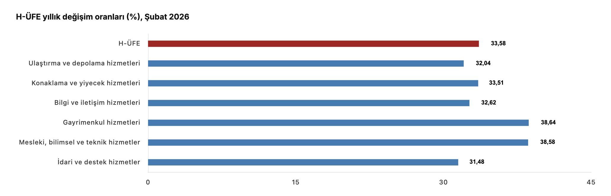 İstanbul, 31 Mart (Hibya) – Hizmet Üretici Fiyat Endeksi (H-ÜFE) 2026 yılı Şubat ayında bir önceki yılın aynı ayına göre yüzde 33,58 artış gösterdi.