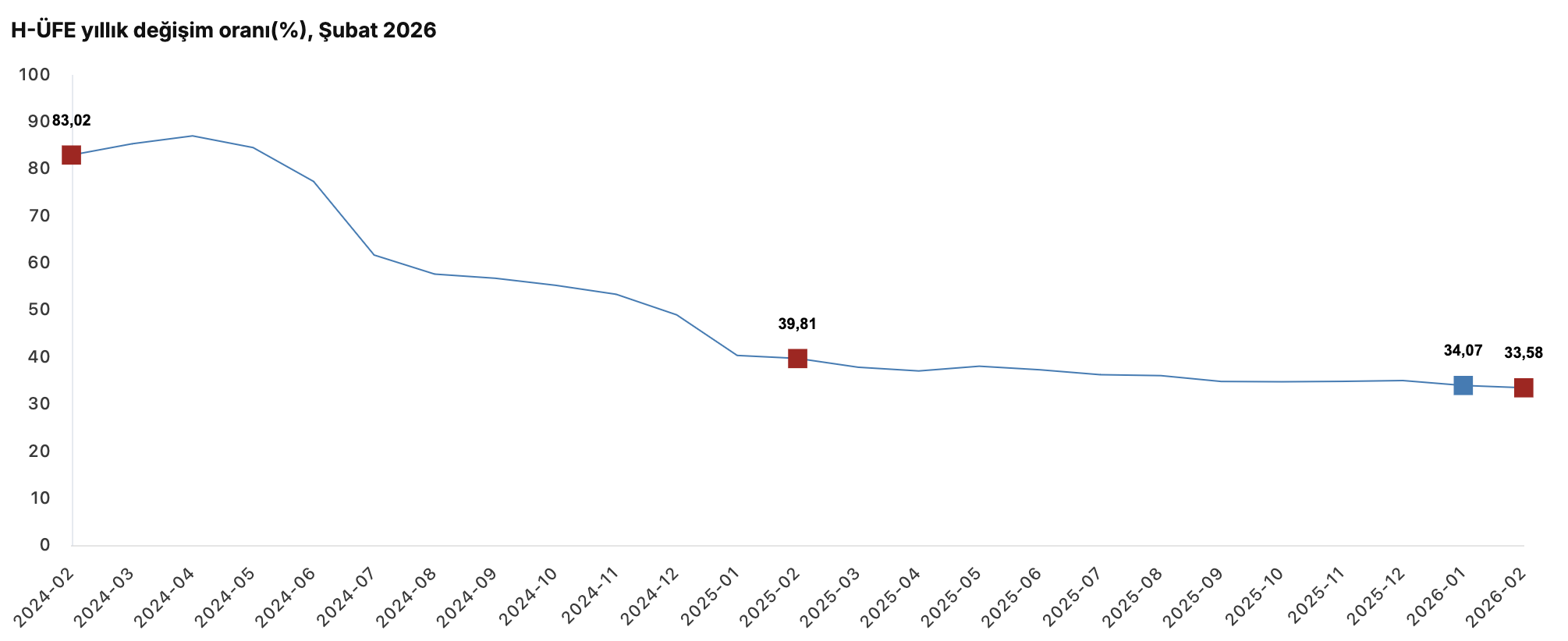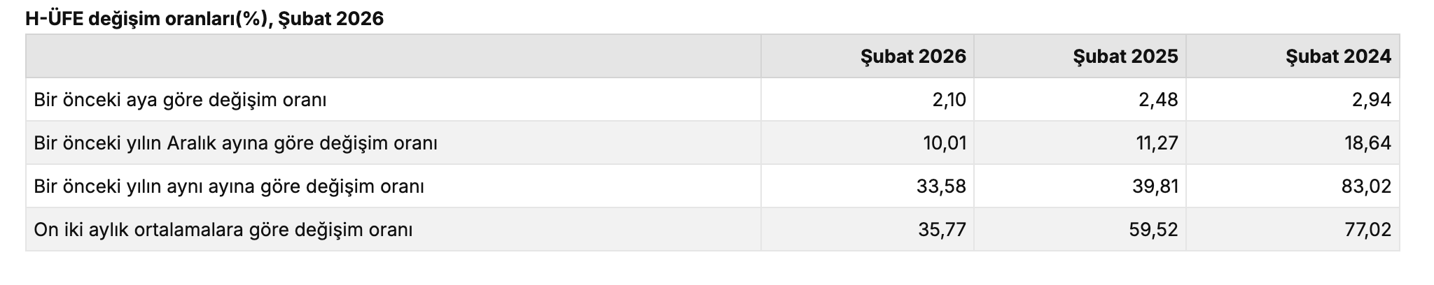 Türkiye İstatistik Kurumu’nun (TÜİK) verilerine göre, H-ÜFE 2026 yılı Şubat ayında bir önceki aya göre yüzde 2,10 artış, bir önceki yılın Aralık ayına göre yüzde 10,01 artış ve on iki aylık ortalamalara göre yüzde 35,77 artış kaydetti.