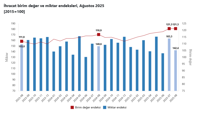 Türkiye İstatistik Kurumu’nun (TÜİK) verilerine göre, ihracat birim değer endeksi Ağustos ayında bir önceki yılın aynı ayına göre yüzde 3,8 yükseldi. Endeks bir önceki yılın aynı ayına göre gıda, içecek ve tütünde yüzde 8,9 yükseldi, ham maddelerde (yakıt hariç) yüzde 5,1 yükseldi, yakıtlarda yüzde 3,8 geriledi, imalat sanayinde (gıda, içecek, tütün hariç) yüzde 3,3 yükseldi.
