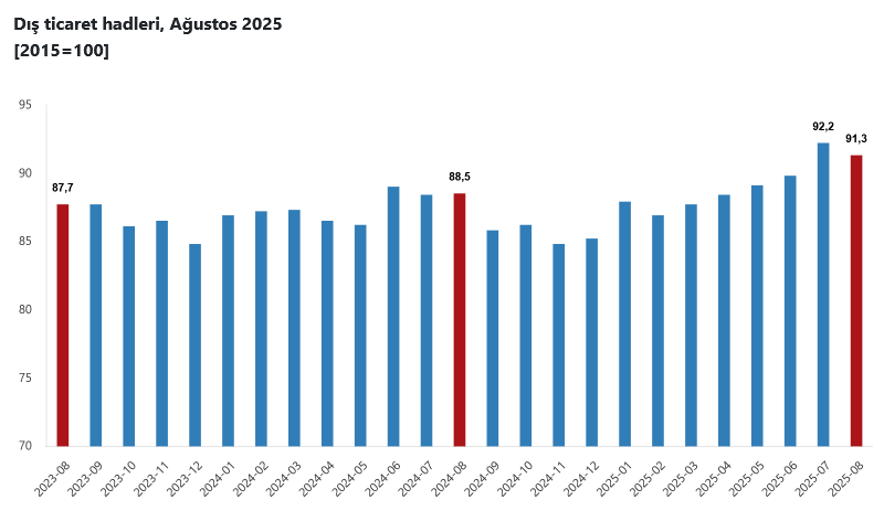 İhracat birim değer endeksinin ithalat birim değer endeksine bölünmesiyle hesaplanan ve 2024 yılı Ağustos ayında 88,5 olarak elde edilmiş olan dış ticaret haddi, 2,8 puan artarak, 2025 yılı Ağustos ayında 91,3 oldu.