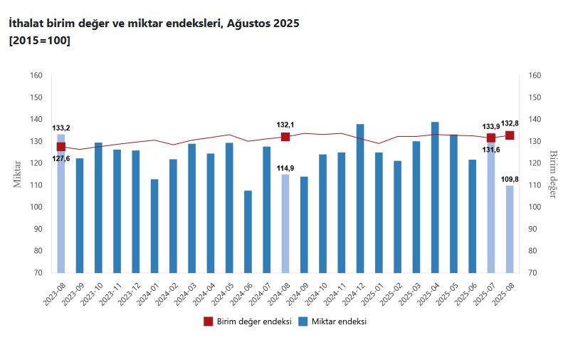 Mevsim ve takvim etkilerinden arındırılmış seriye göre ithalat miktar endeksi; 2025 Temmuz ayında 122,7 iken 2025 Ağustos ayında yüzde 7,2 azalışla 113,8’e geriledi. Takvim etkilerinden arındırılmış seriye göre ise ithalat miktar endeksi; 2024 yılı Ağustos ayında 114,7 iken 2025 yılı Ağustos ayında yüzde 4,5 azalışla 109,6 oldu.