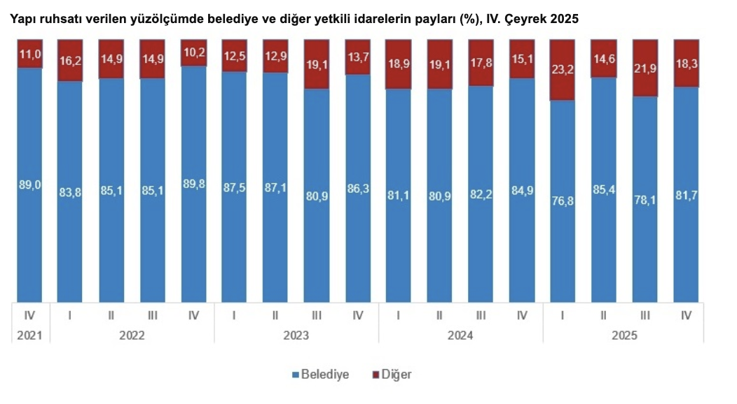 2025 yılı IV. çeyreğinde yapı ruhsatı verilen toplam yüzölçümün, yüzde 81,7'si belediyeler, yüzde 18,3'ü ise diğer yetkili idareler tarafından verildi.
