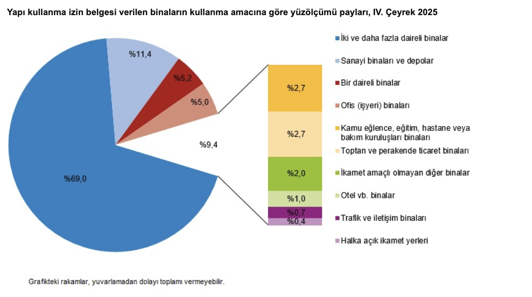 2025 yılı IV. çeyreğinde yapı kullanma izin belgesi verilen binaların kullanma amacına göre en yüksek yüzölçüm payına 32,6 milyon m² ile iki ve daha fazla daireli ikamet amaçlı binalar sahip oldu. Bunu 5,4 milyon m² ile sanayi binaları ve depolar izledi.