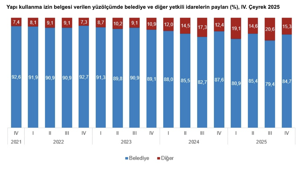 2025 yılı IV. çeyreğinde yapı kullanma izin belgesi verilen toplam yüzölçümün, yüzde 84,7'si belediyeler, yüzde 15,3'ü ise diğer yetkili idareler tarafından verildi.