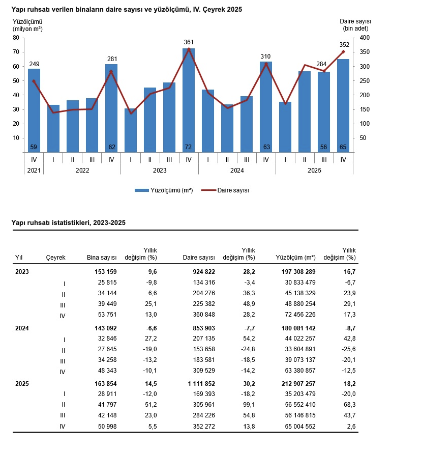 Türkiye İstatistik Kurumu’nun (TÜİK) verilerine göre, bir önceki yılın aynı çeyreğine göre, 2025 yılı IV. çeyreğinde yapı ruhsatı verilen bina sayısı yüzde 5,5, daire sayısı yüzde 13,8 ve yüzölçüm yüzde 2,6 arttı.