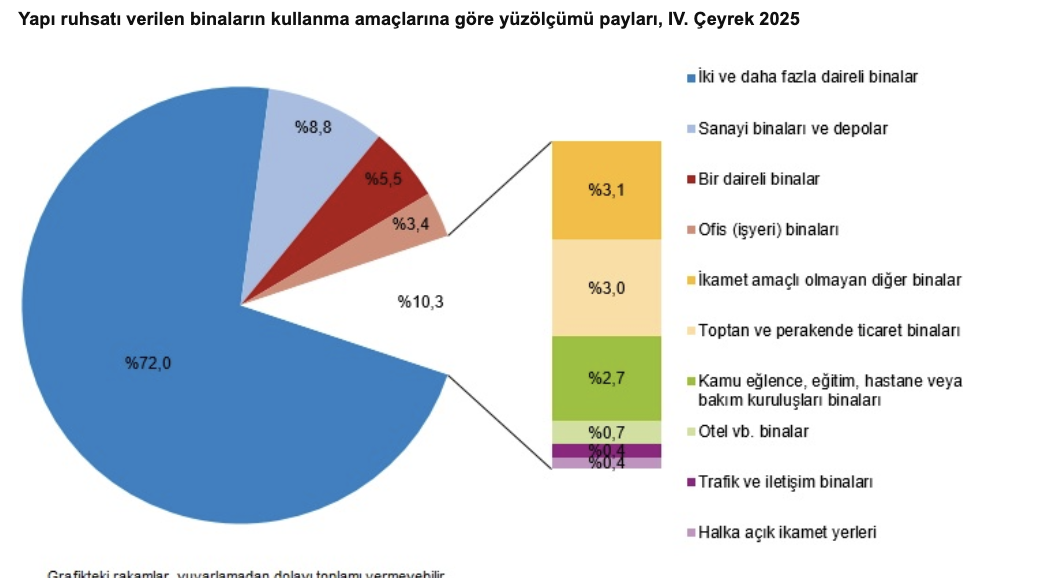 2025 yılı IV. çeyreğinde yapı ruhsatı verilen binaların kullanma amacına göre en yüksek yüzölçüm payına 46,8 milyon m² ile iki ve daha fazla daireli ikamet amaçlı binalar sahip oldu. Bunu 5,7 milyon m² ile sanayi binaları ve depolar izledi.