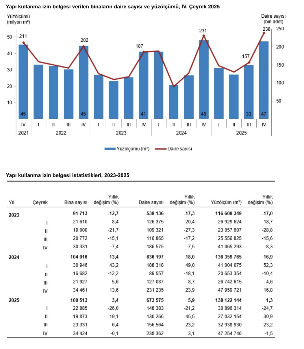 Bir önceki yılın aynı çeyreğine göre, 2025 yılı IV. çeyreğinde yapı kullanma izin belgesi verilen bina sayısı yüzde 0,1 ve yüzölçüm yüzde 1,5 azalırken daire sayısı yüzde 3,1 arttı.